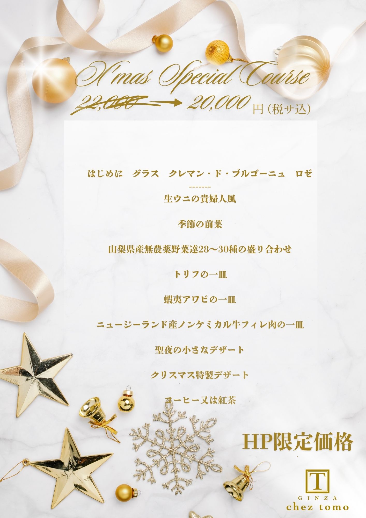 ※ 12月20日~25日の期間、ディナーはクリスマスプコースのみのご予約となります。